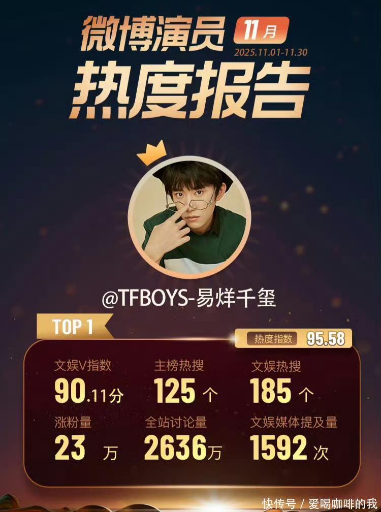 此次登顶11月微博演员热度冠军,既是对易烊千玺过往努力的肯定,也是市场与观众对其综合实力的高度认可。从流量偶像到实力派演员,他用一步步扎实的脚印,走出了属于自己的成长之路,每一份数据都是实力的见证,每一份热度都是口碑的积累。未来,期待易烊千玺继续坚守初心,深耕演艺领域,带来更多优质作品,在热爱的舞台上持续发光发热,书写更多属于自己的精彩篇章。